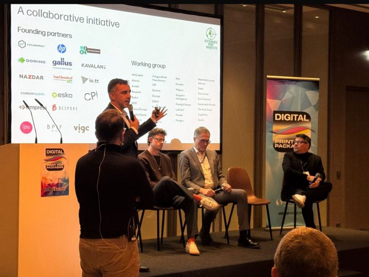 • Carlos Lahoz, Industrial Print Sustainability Strategist at HP and a Sustainable Print Manifesto Founding Partner, presenting at the launch of the Sustainable Print Manifesto in Berlin.